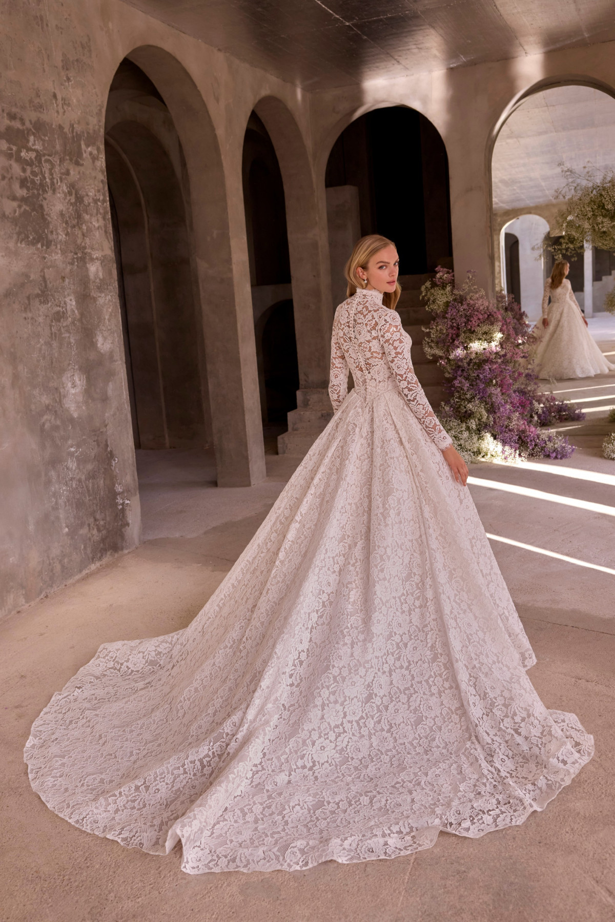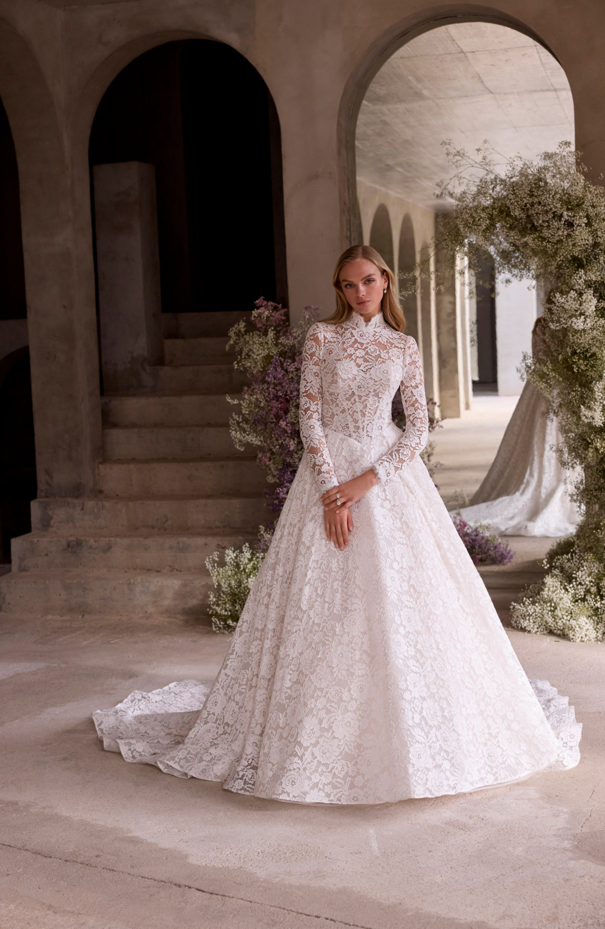 A romantic ball gown wedding dress featuring a high neckline and long sleeves, crafted in delicate peony lace. The structured boned bodice is designed with a flattering basque waist, flowing into a full skirt for a timeless, regal silhouette.
